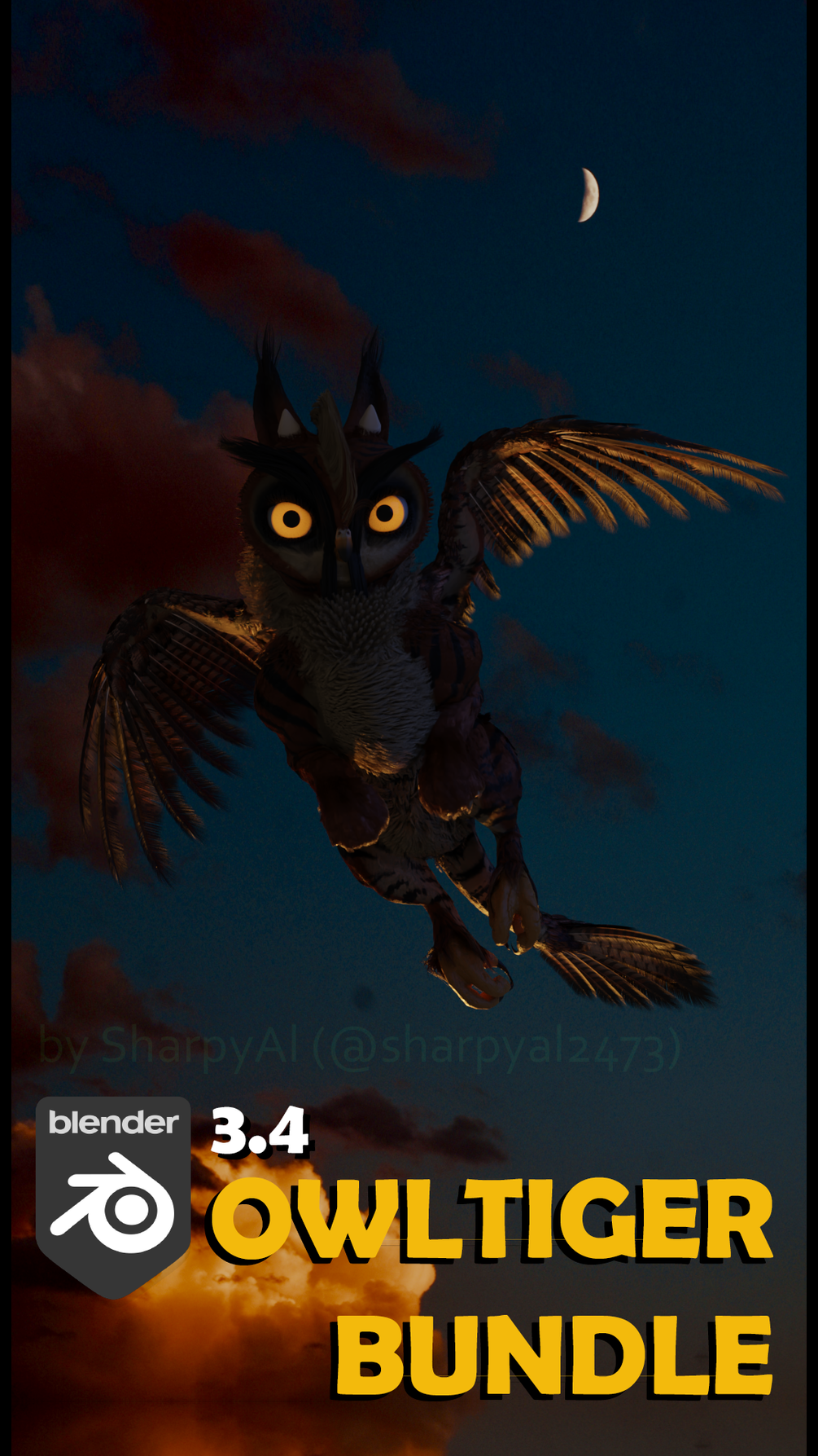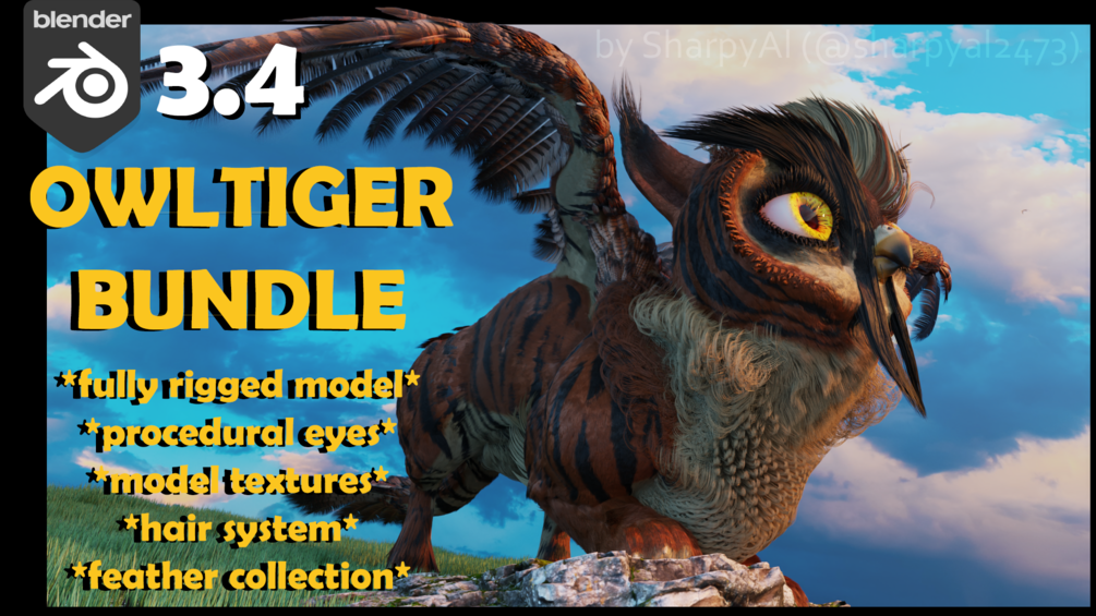 In this Owltiger Bundle, you will get the Owltiger model and the 19 owltiger-colored feathers used for the project, all contained in a single .blend file. Also, you will get an additional Feather Asset Pack with access to the easy-to-edit procedural version of 19 feathers and their respective Photoshop files for accurate coloring of each feather type.